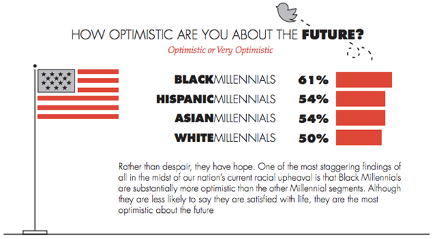 Black millennials are more optimistic about their futures than Hispanic, Asian and even White Millennials according to research done by the University of Texas-Austin and Hispanic advertising agency Richards/Lema.